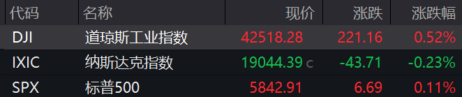 当地时间周二,美国三大股指涨跌互现,道琼斯工业平均指数上涨0.52%,标准普尔500指数上涨0.11%,纳斯达克综合指数下跌0.23%。