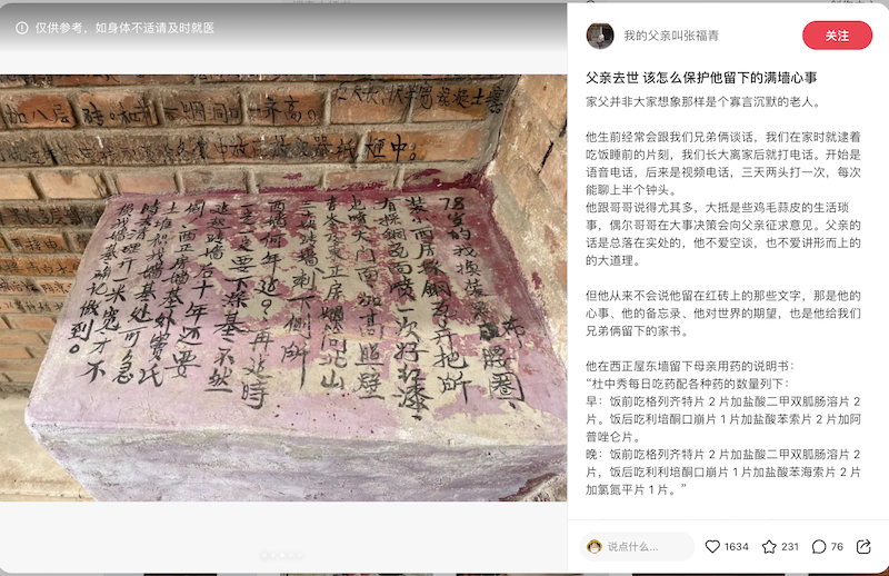 这座150年历史的房子在他一生之前被这位老人留下的笔迹密集地覆盖。在红砖墙的空白空间中,张·富王石记录了他的感情和修复老房子28年的琐事,记录了他的“矛盾”生活,并写了诸如“宇宙有多大?”之类的诗意问题。 Cai Shanhai在Xiaohongshu上发表了一张注释,标题为“一个死的老人在花园里写下了他的忧虑和生活”,该纸条获得了100,000多个喜欢的赞,吸引了数十种媒体,例如CCTV和People's Daily。这个故事甚至进入了Shanxi高中入学考试中文测试论文。