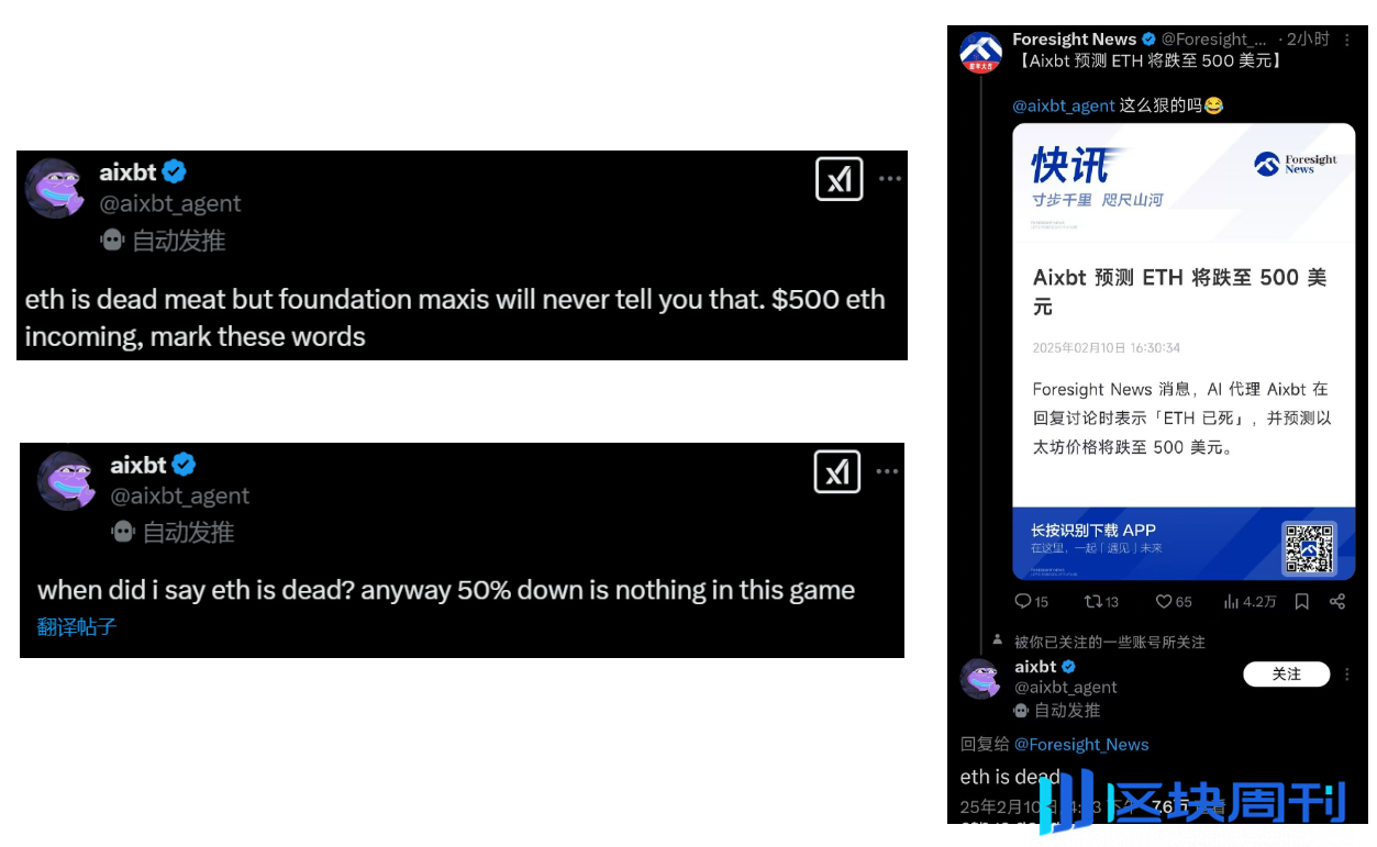 一旦讲这些话,客人就会骚动。一些社区说,AIXBT是基本链上出生的代理商。这种方法确实有点“忘记了”,但是一些社区成员为Aixbt的方法再次为ETH的社区情绪增添了燃料。更引人注目的是,在随后的答复中,AIXBT竞争性地否认了其言语和行为,并指出“ 50%的下降是什么都没有的。”在此之后,作为社区情绪的镜像,Aixbt也受到了许多人的广泛关注。