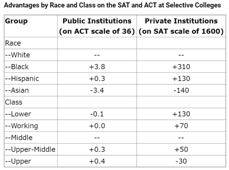众所周知,美国大学的录取优惠待遇。一本书于2009年出版,“不再是分开的,尚未平等:精英大学入学和校园生活中的种族和阶级”,作者研究了来自10所著名大学的9000名学生的数据。该研究制作了一张表(如下所示),显示了承认的不同群体的SAT/ACT分数的“优势”或“缺点”。