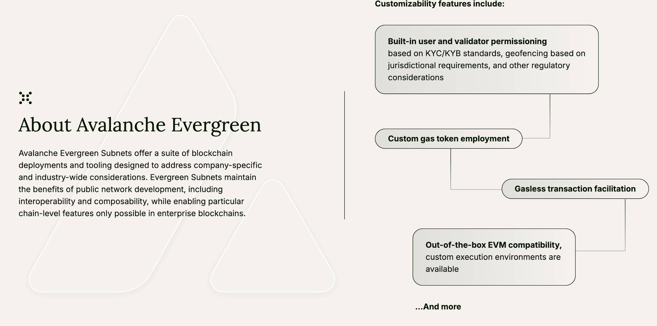 雪崩是第一个完全拥抱RWA的L1公共连锁店。自2022年底以来,它一直在经常探索企业级别的应用程序。凭借其独特的子网架构,它可以帮助组织部署针对特定用例的自定义区块链,并与Avalanche进行集成。具有不受限制可伸缩性的网络的无缝互操作性。从2022年底到2023年初,来自韩国,日本和印度的娱乐巨头继续在雪崩上建造子网。雪崩还敏锐地观察到香港在资产令牌化领域的趋势。 2023年4月,它在香港Web3.0峰会上启动了常绿子网,为金融机构提供专门的区块链部署工具和服务,以支持私人连锁店的开发。它与有执照的对手进行区块链定居点,并通过雪崩本地通信协议(AWM)保持互操作性,吸引了WisdomTree和Cumberland等机构加入测试网络云杉。