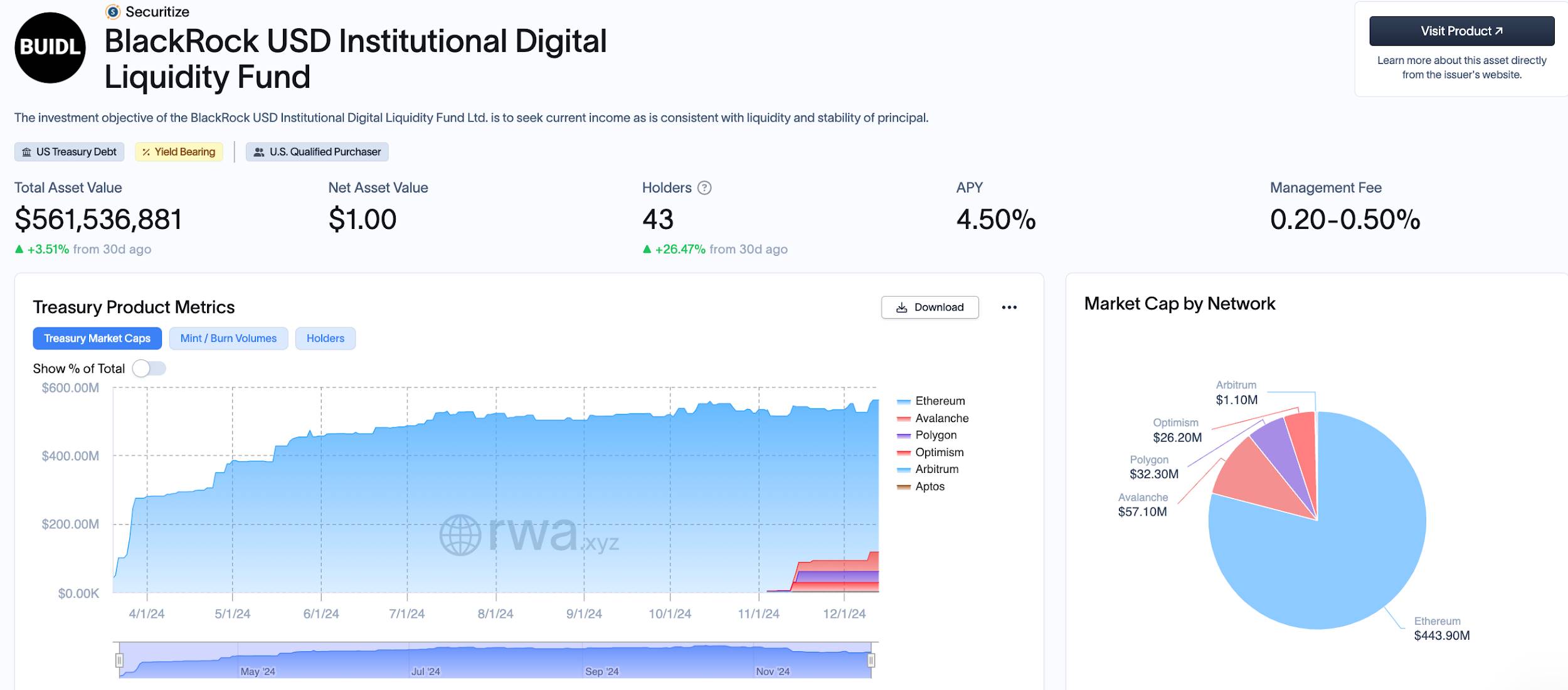 今年3月,贝莱德推出首只在公链上发行的美债代币化基金BUIDL,引起市场关注。该基金为合格投资者提供了通过美国债务赚取收入的机会,并首先部署在以太坊区块链上,后来扩展到 Aptos、Optimism、Avalanche、Polygon 和 Arbitrum 等多个区块链。目前,$BUIDL作为代币收入凭证尚无实际用途,但其具有里程碑意义的发布,向代币化金融迈出了重要一步。