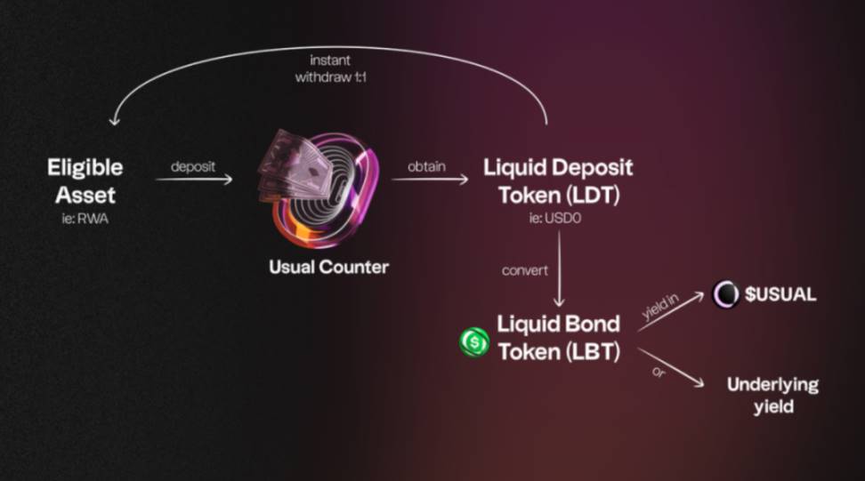 Usual Protocol推出的稳定币USD0通过将美国国债等传统金融资产代币化,提供了两种铸币方式:用户可以通过直接充值RWA资产直接铸币USD0,也可以通过充值USDC/USDT间接铸币USD0。 USD0升级为收益率更高的USD0++,并通过与Pendle等DeFi平台合作为用户提供额外的忠诚度奖励。